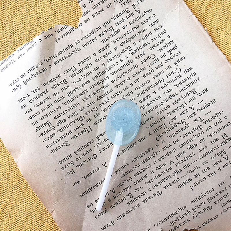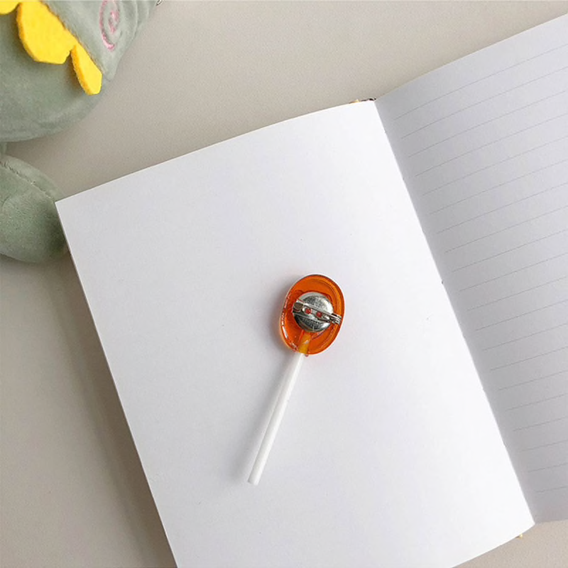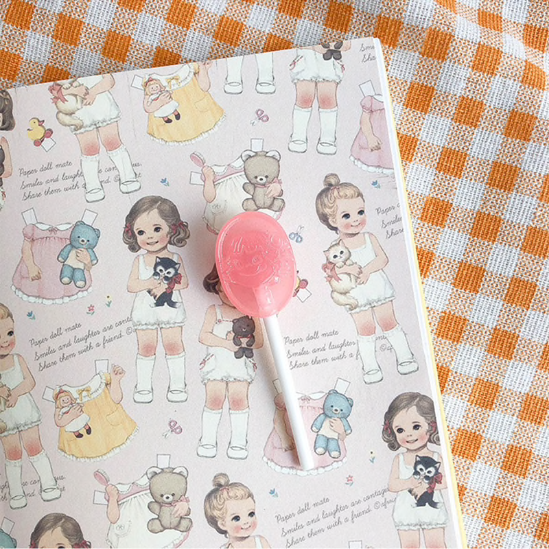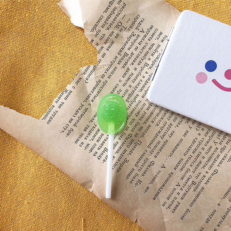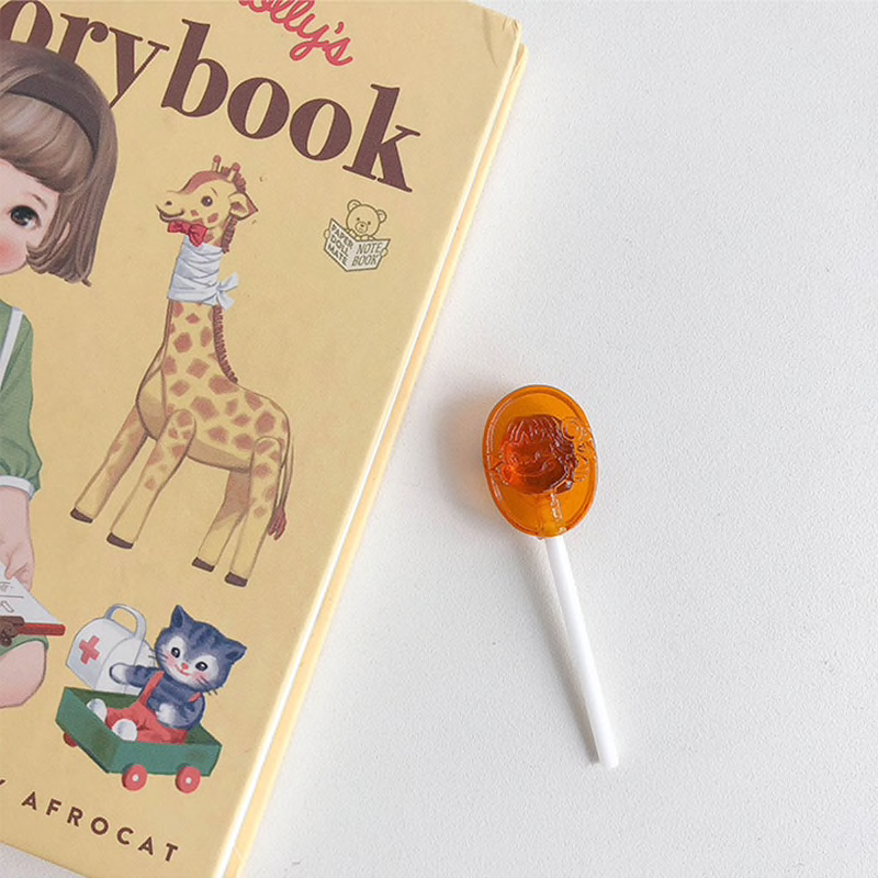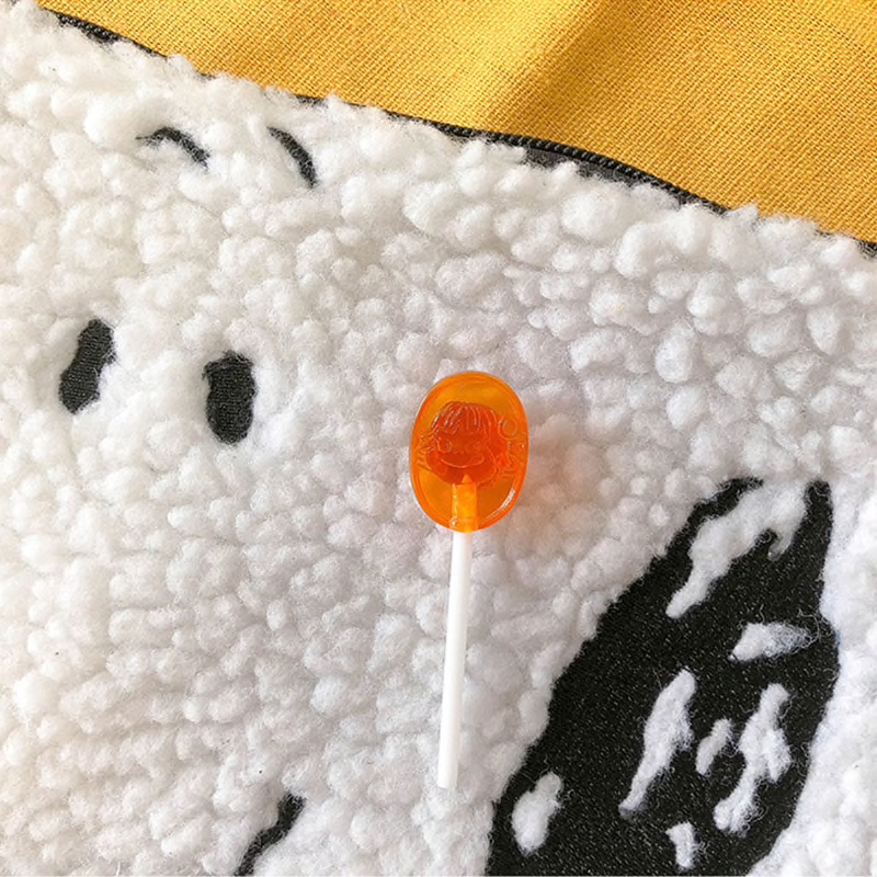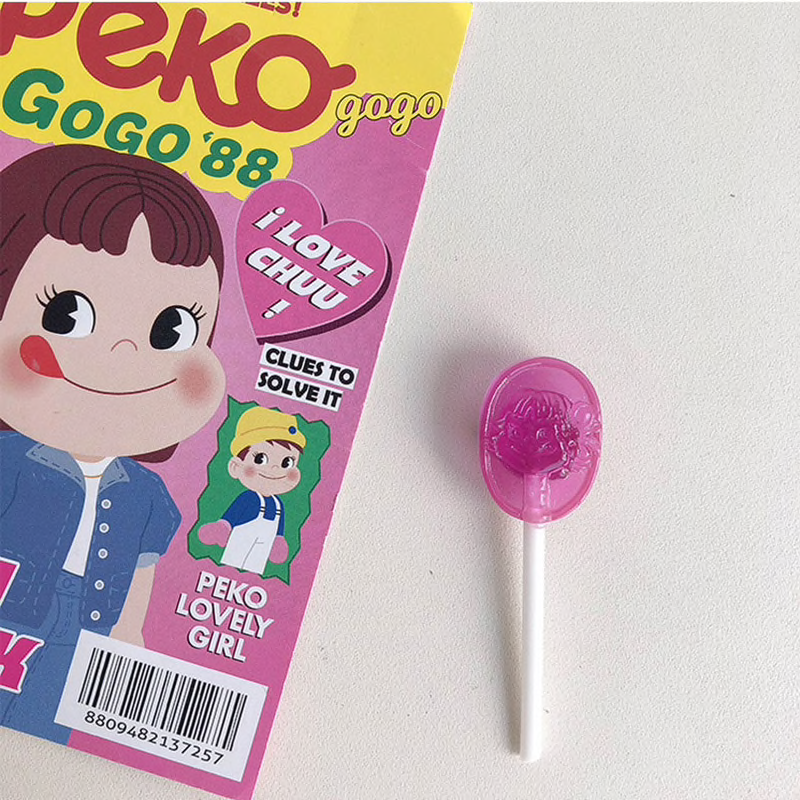 Lollipop candy brooch with embossed Milky Candy mascot Peko Chan, available in 7 different colours, 6.5cm big.