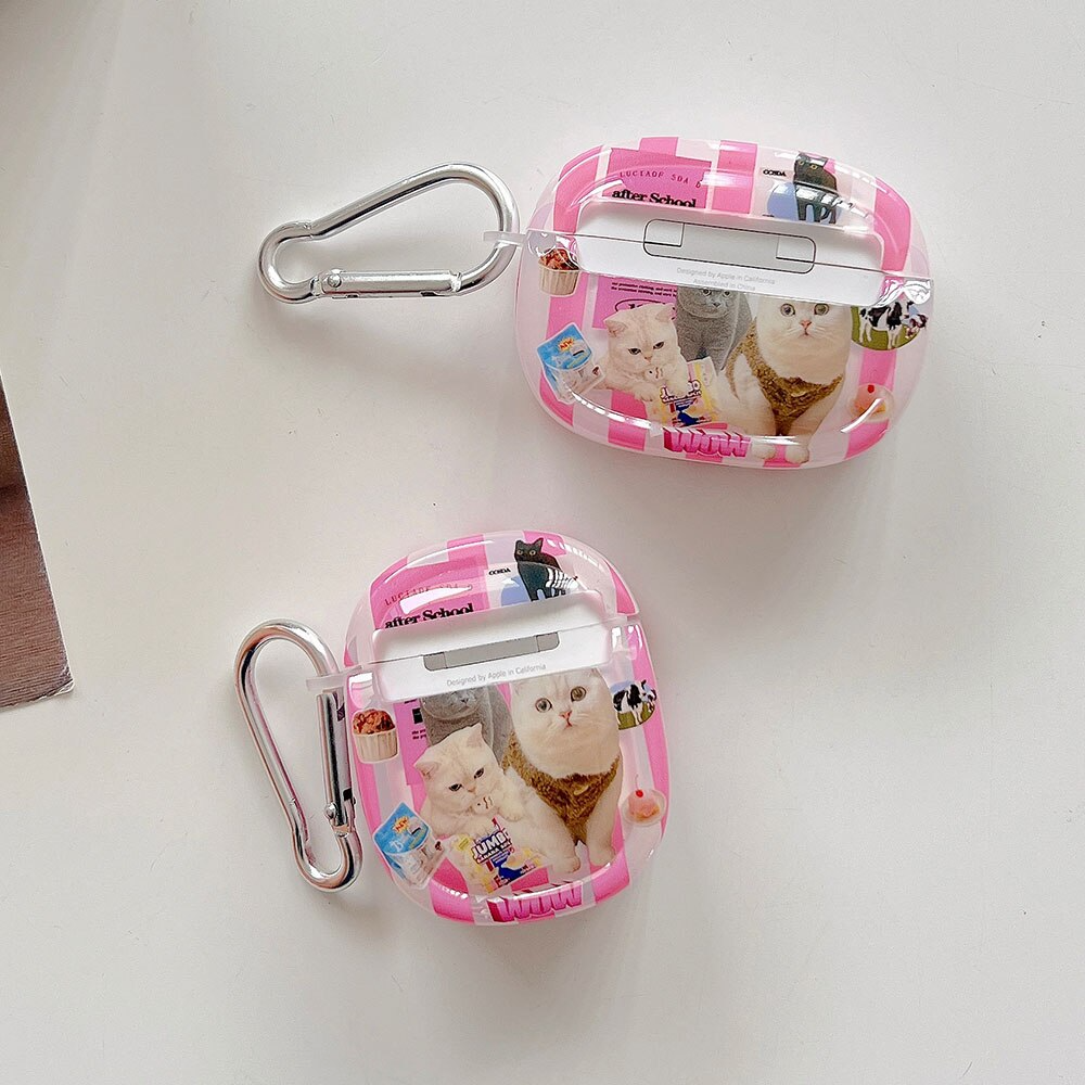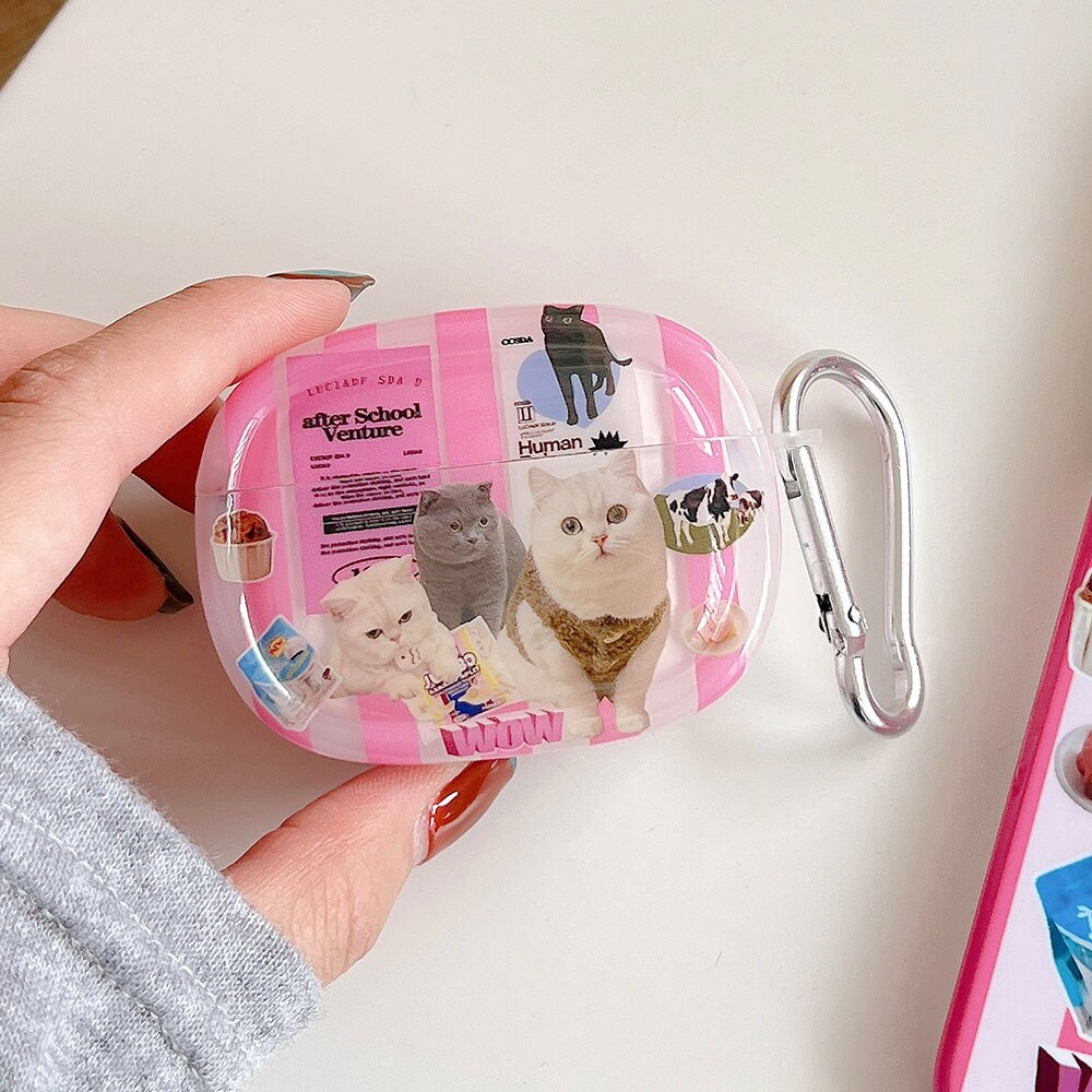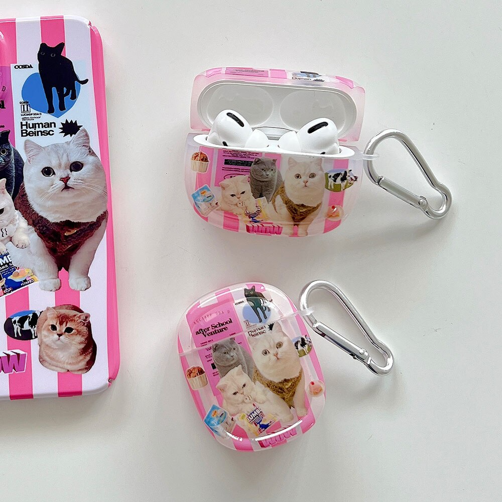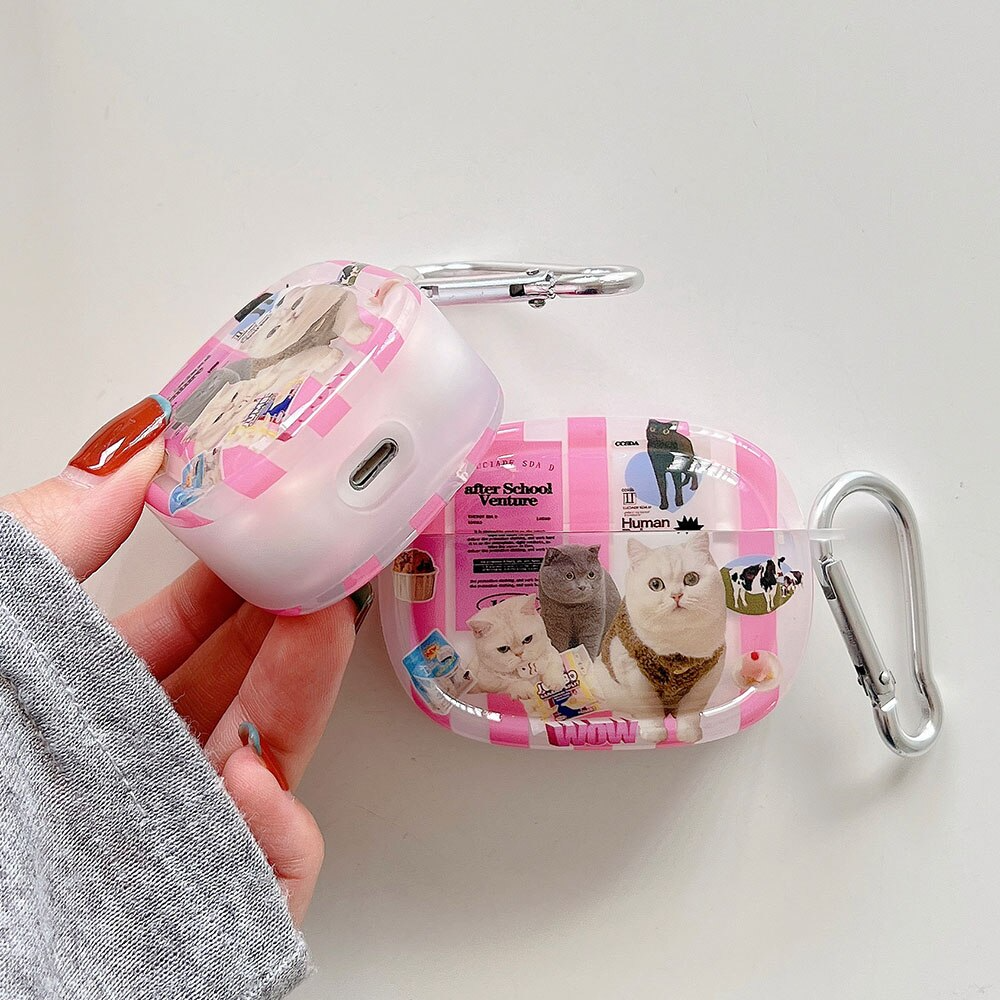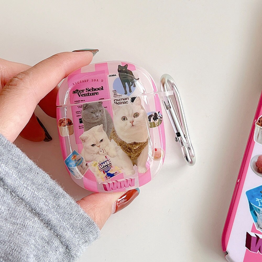 Pink protective cover for AirPods cases (AirPods charger case not included!) with photographic cat collage design, strap loop and attached clasp.