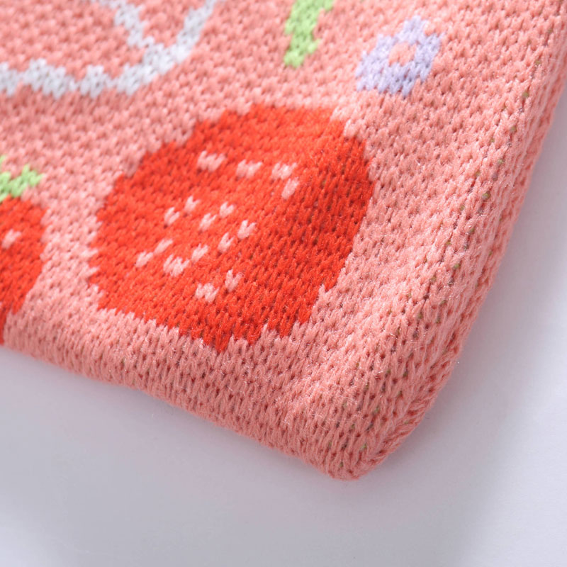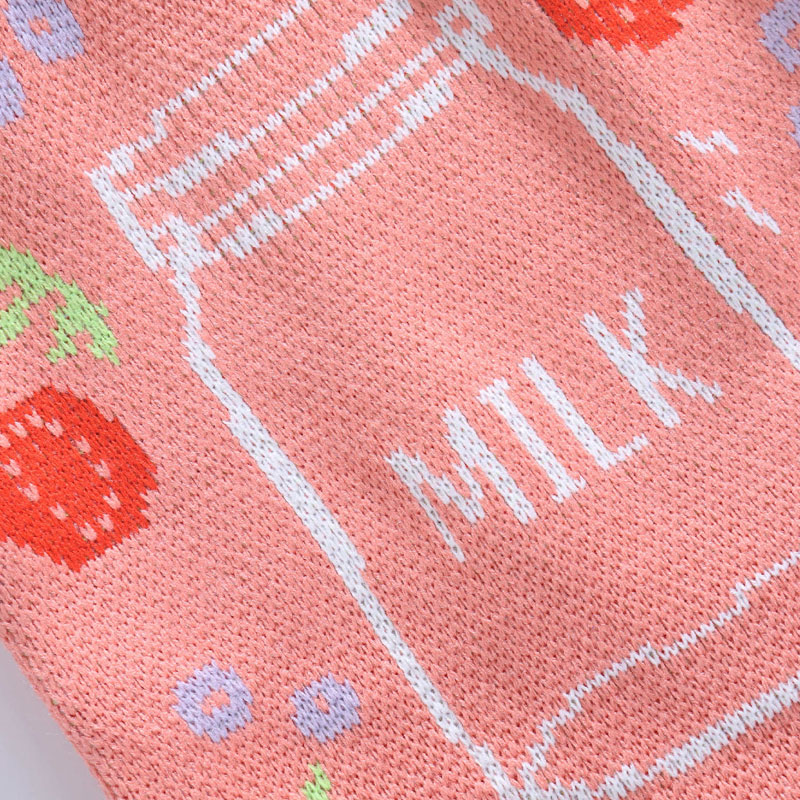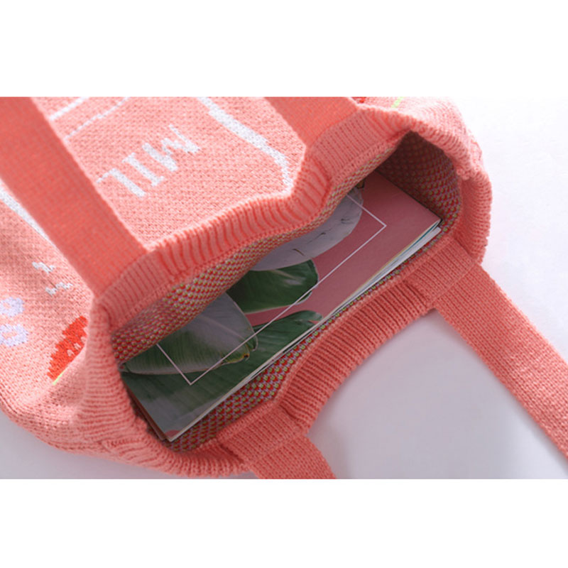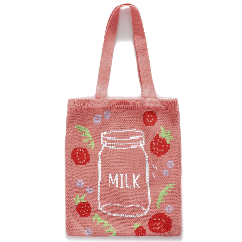This stylish knitted tote bag will turn heads! Its bright pink color and cute strawberry and milk illustration create a fun and unique design. The strong yet lightweight fabric makes this bag perfect for carrying your everyday items.