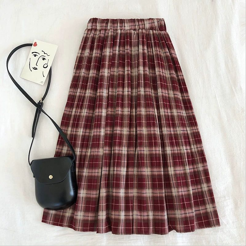 90s style pleated check pattern midi/maxi skirt with elasticated waist, available in black and red.