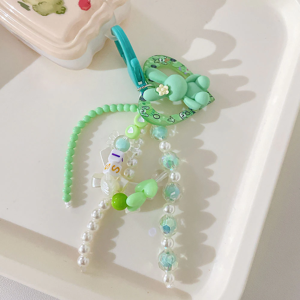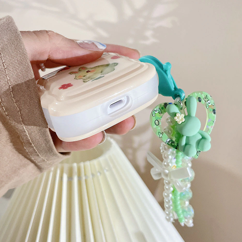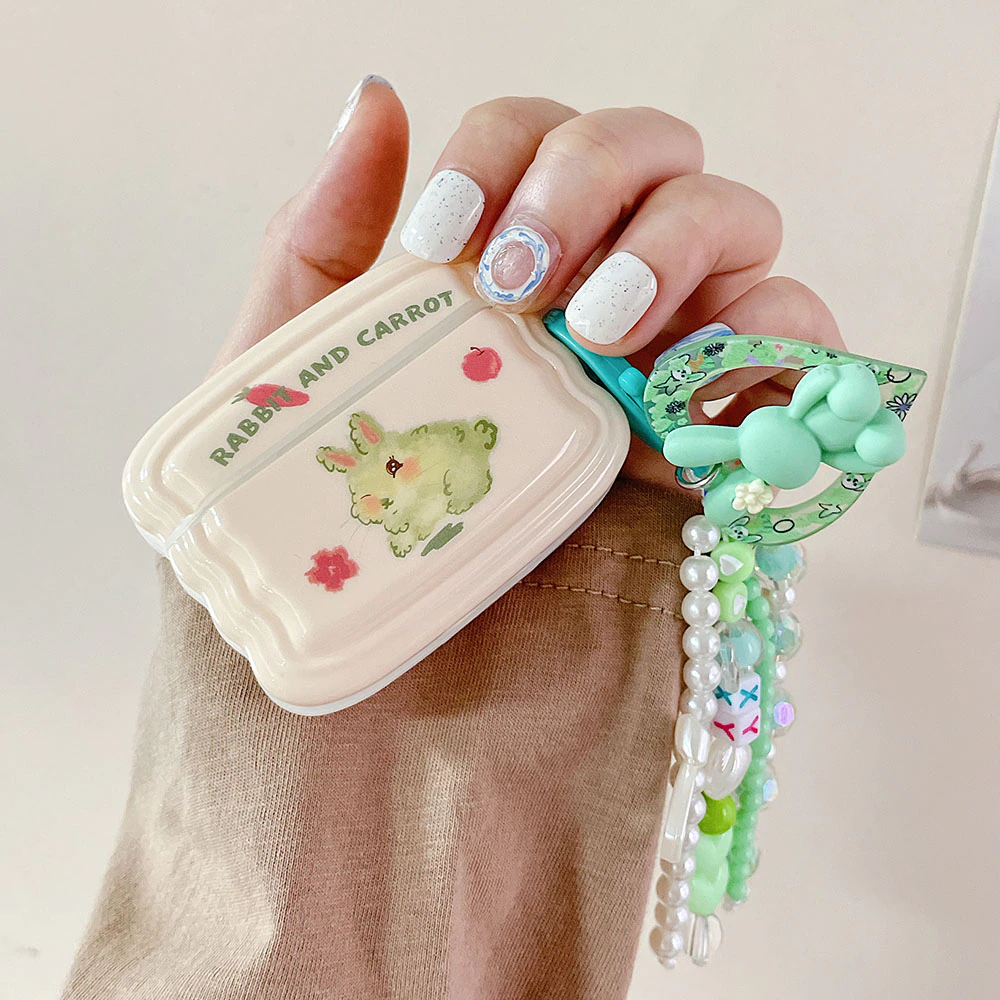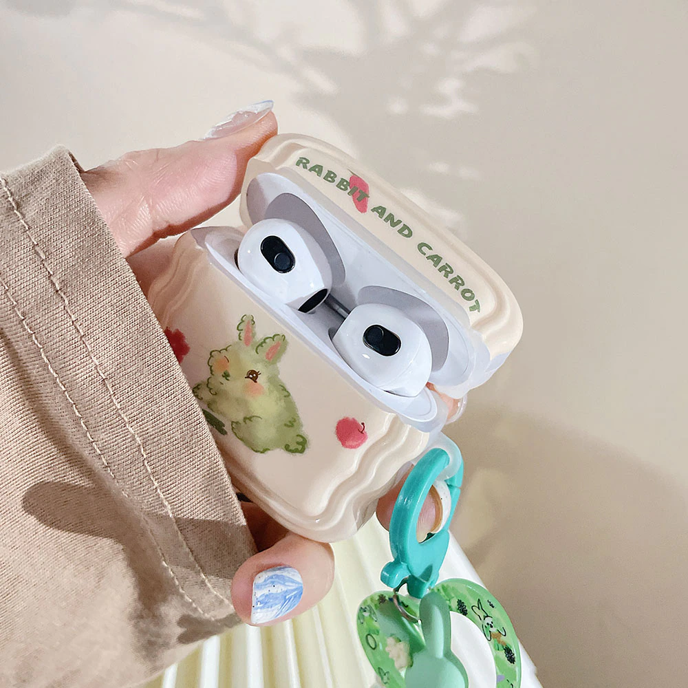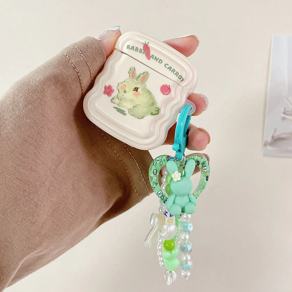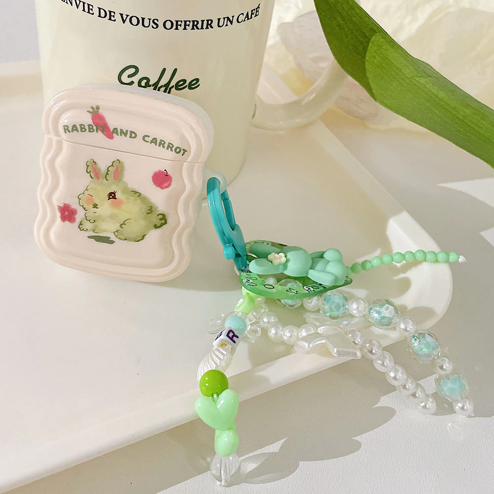 Cute kidcore style protective cover for AirPods cases (AirPods charger case not included!) with bunny and carrots print, clasp loop with heart shaped charm with bunny and mulsticolored beaded strap.