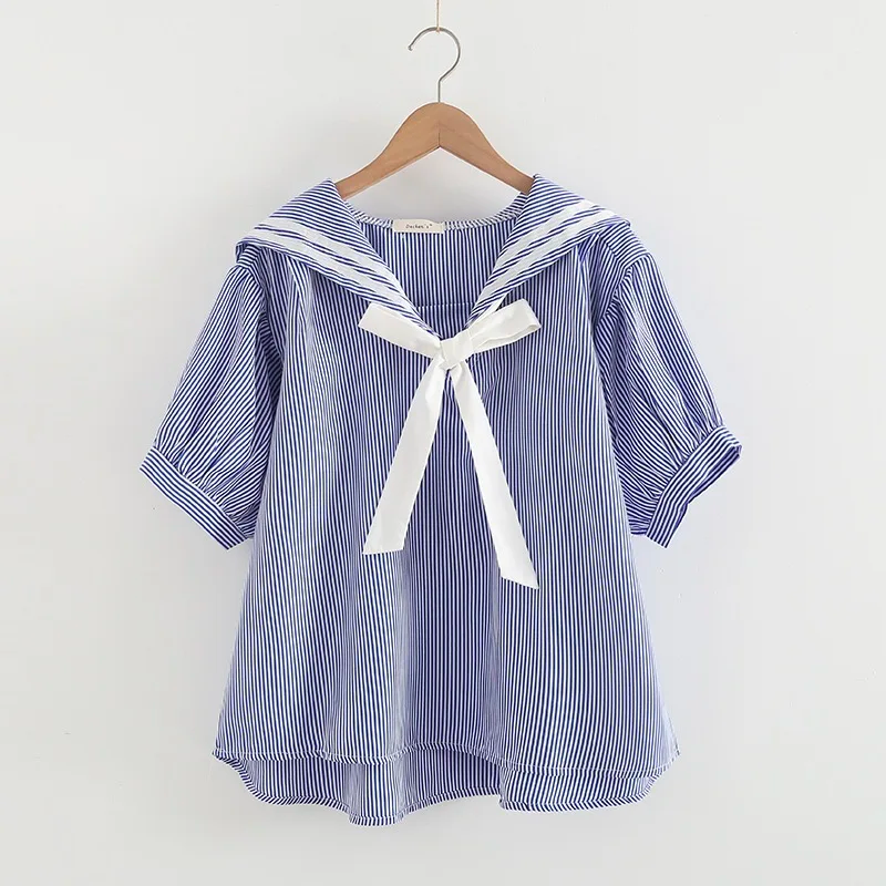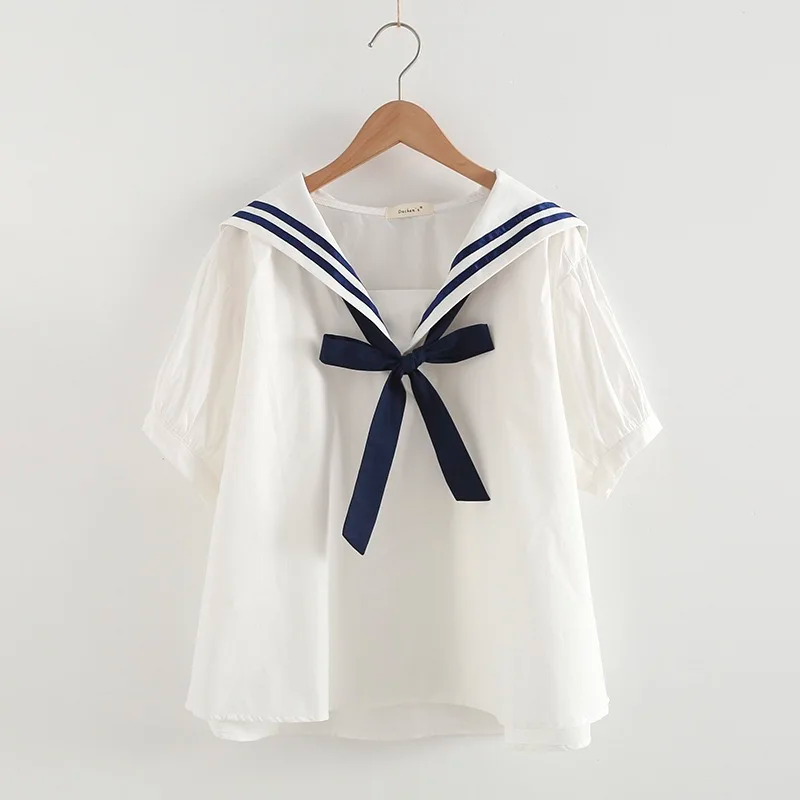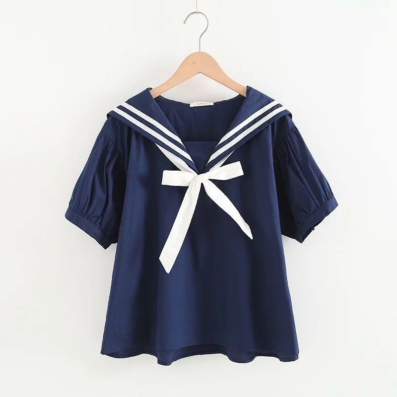 Set sail in style with our Sailor Collar Bow Blouse! This adorable short-sleeved blouse features a classic sailor collar with contrasting striping and a decorative bow detail. Available in four unique shades, this blouse adds a playful twist to any outfit. Channel your inner sailor and make a statement with this charming blouse.