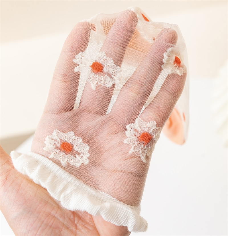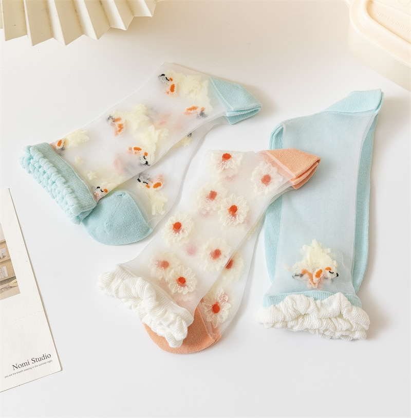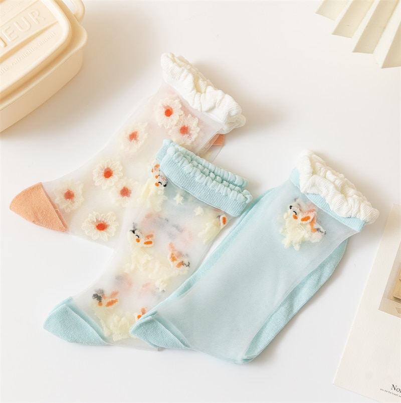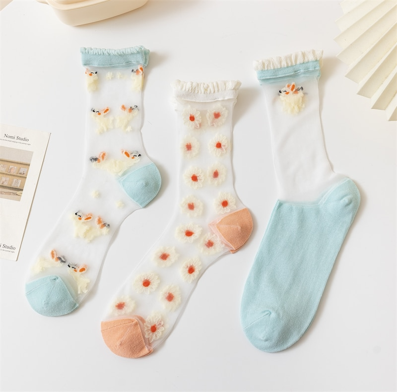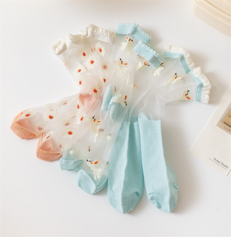 Pretty sheer socks with embroidered bunny pattern! Available in three different designs, will fit up to a size EU39.