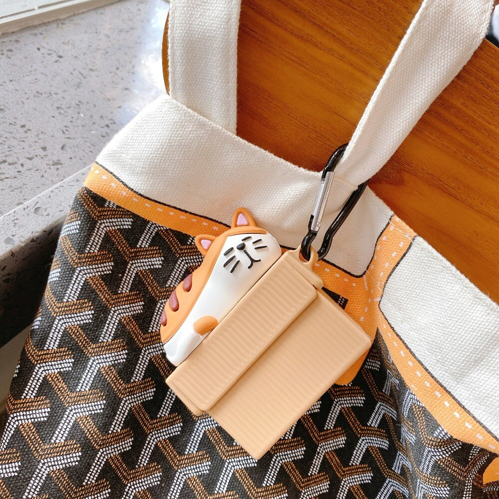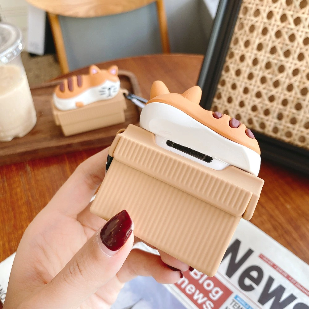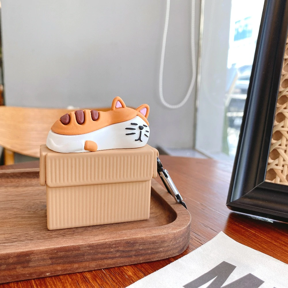 Cute soft protective cover for Airpod cases (Airpod charger case not included!) with clip, shaped like a cat sleeping on a cardboard box! Will fit Airpods 1/2 and Airpods Pro.