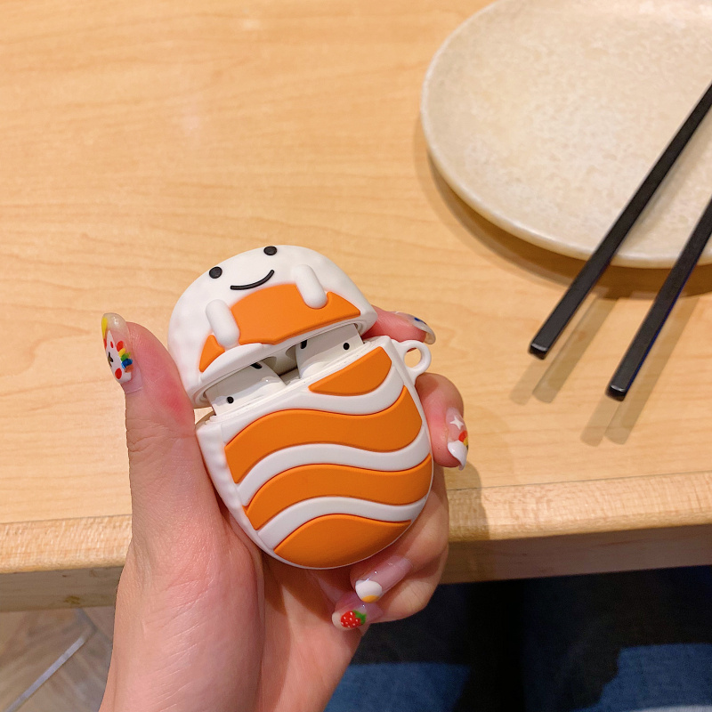 Cute soft protective cover for Airpod cases (Airpod charger case not included) with clip option shaped like a piece of salmon sushi or onigiri with a smiling face, available for Airpods 1/2 and Airpods Pro!
