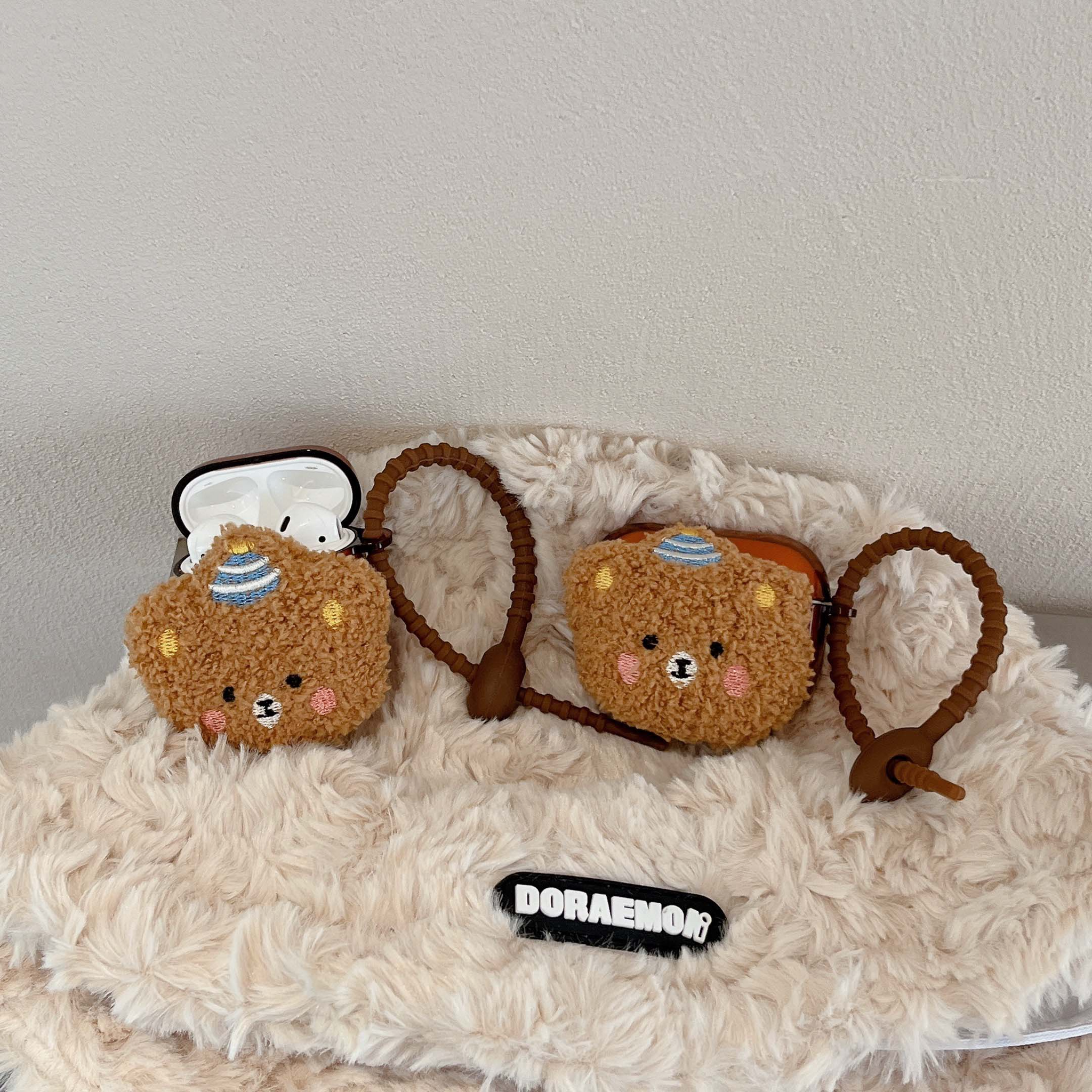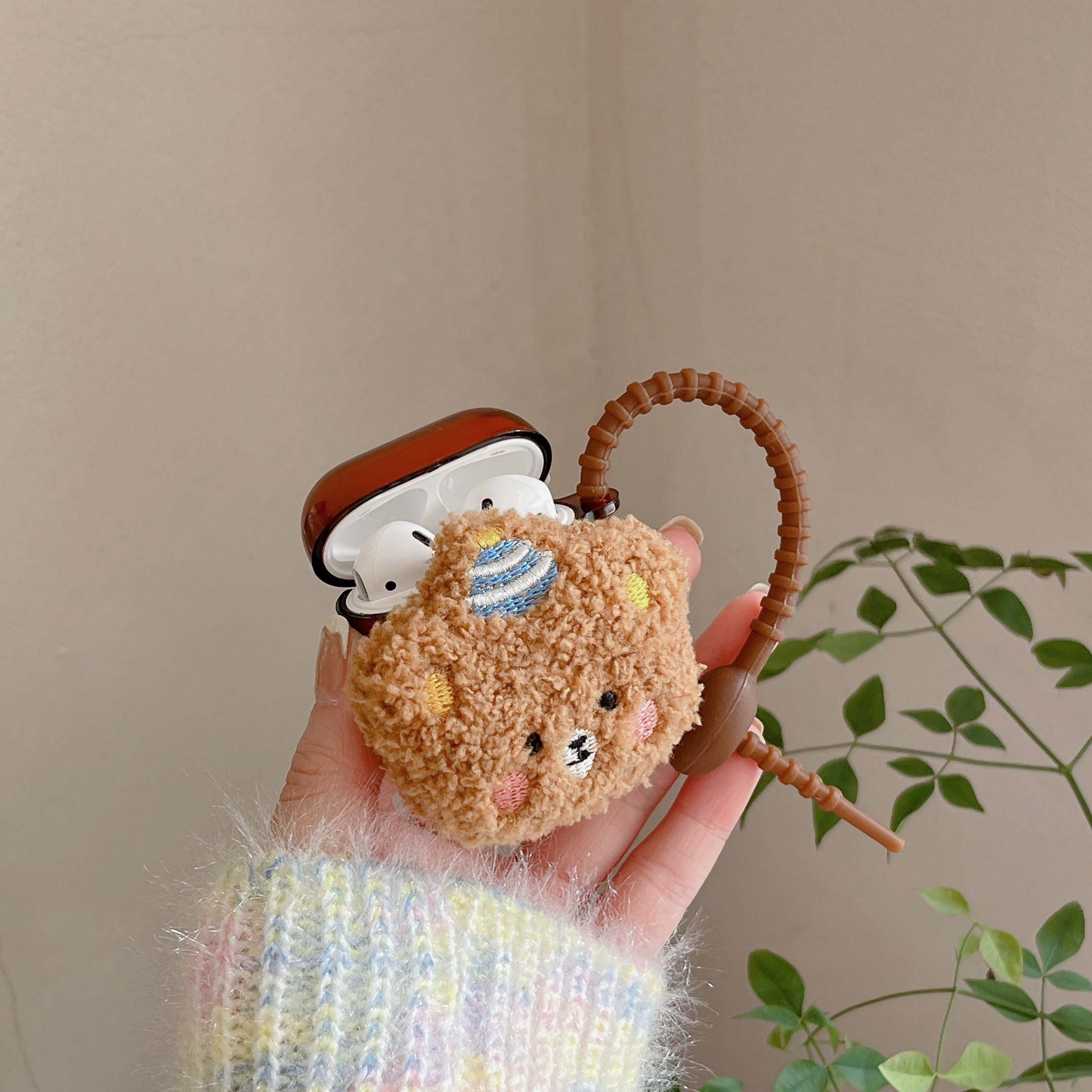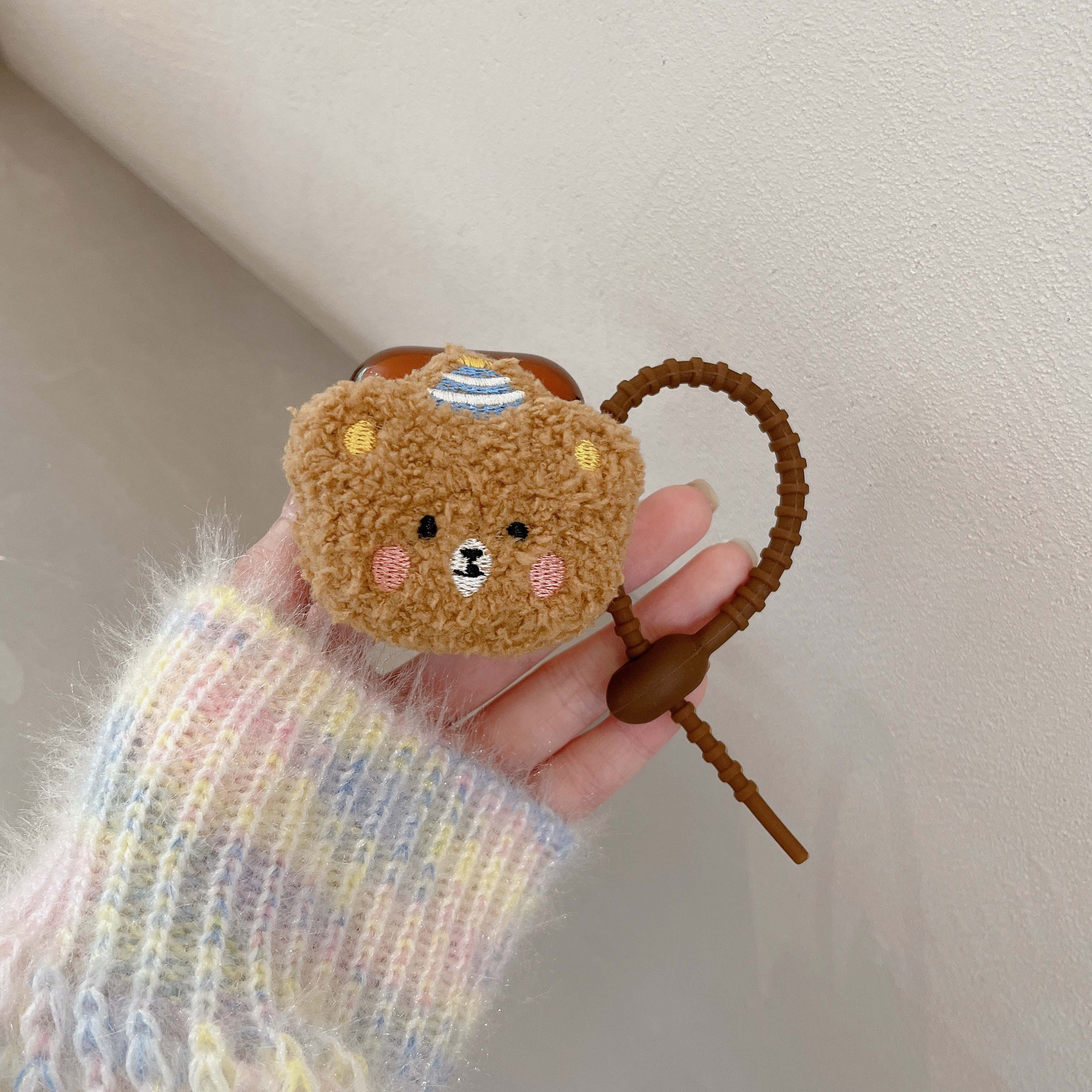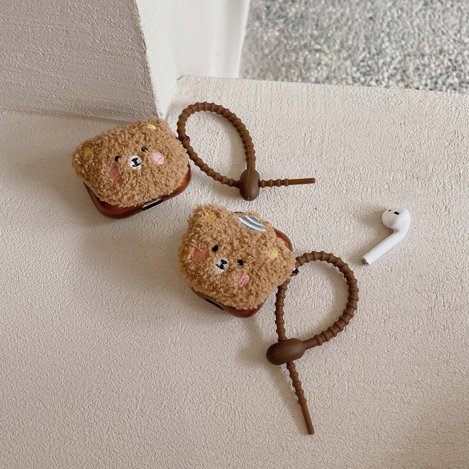 Cute brown cover for Airpod cases (Airpod charger case not included!), with a plush teddy bear wearing a striped hat on the front.
