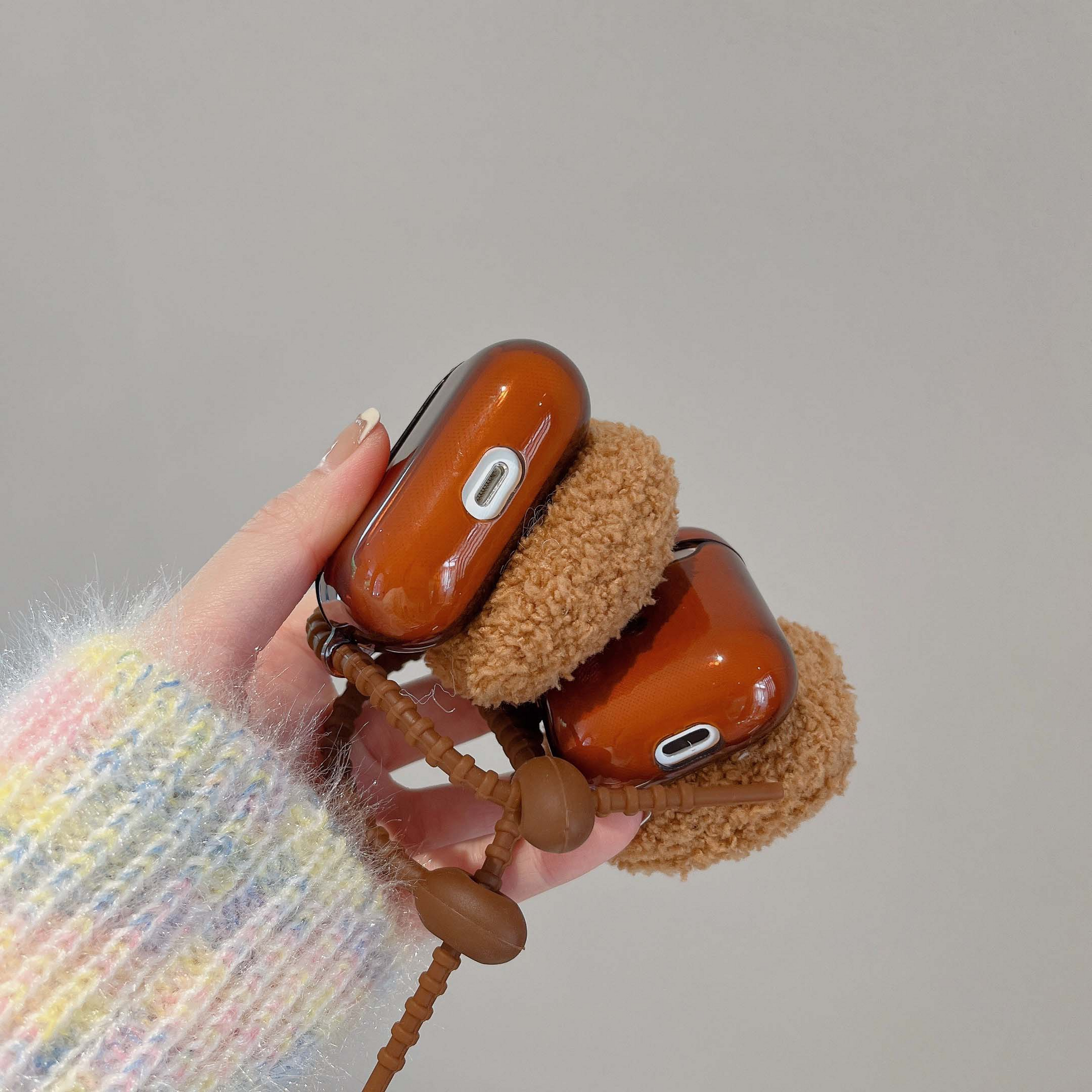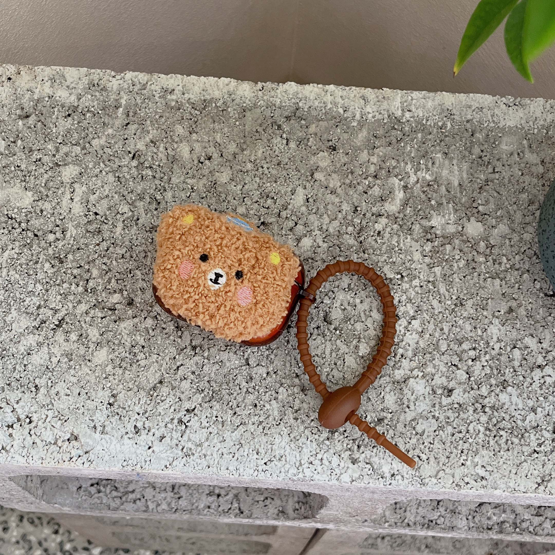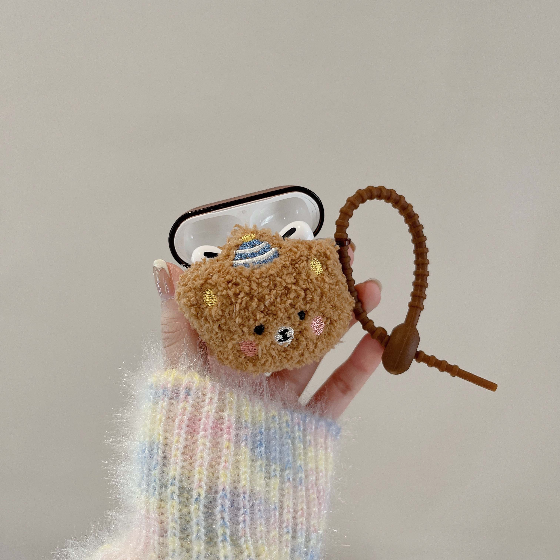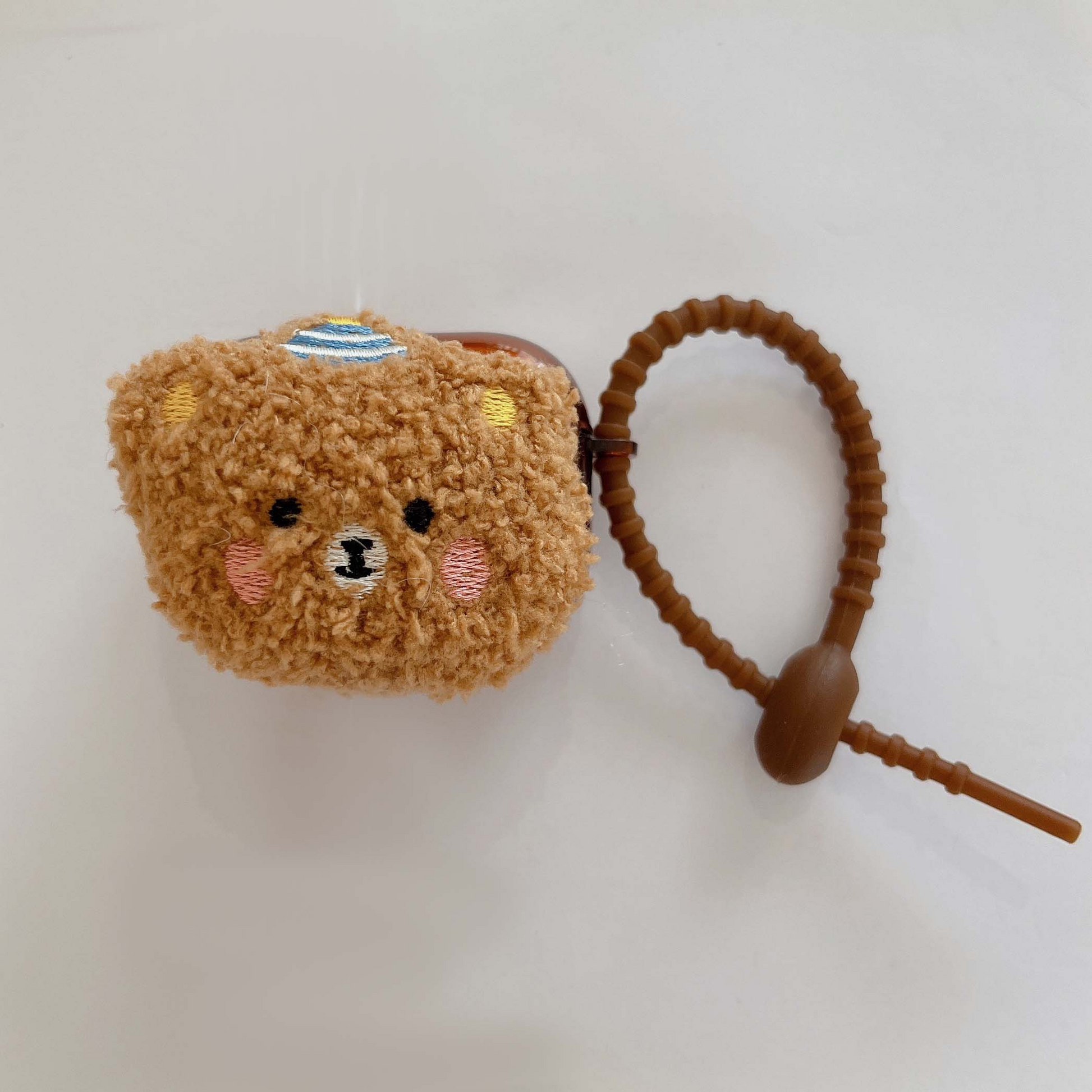 Cute brown cover for Airpod cases (Airpod charger case not included!), with a plush teddy bear wearing a striped hat on the front.