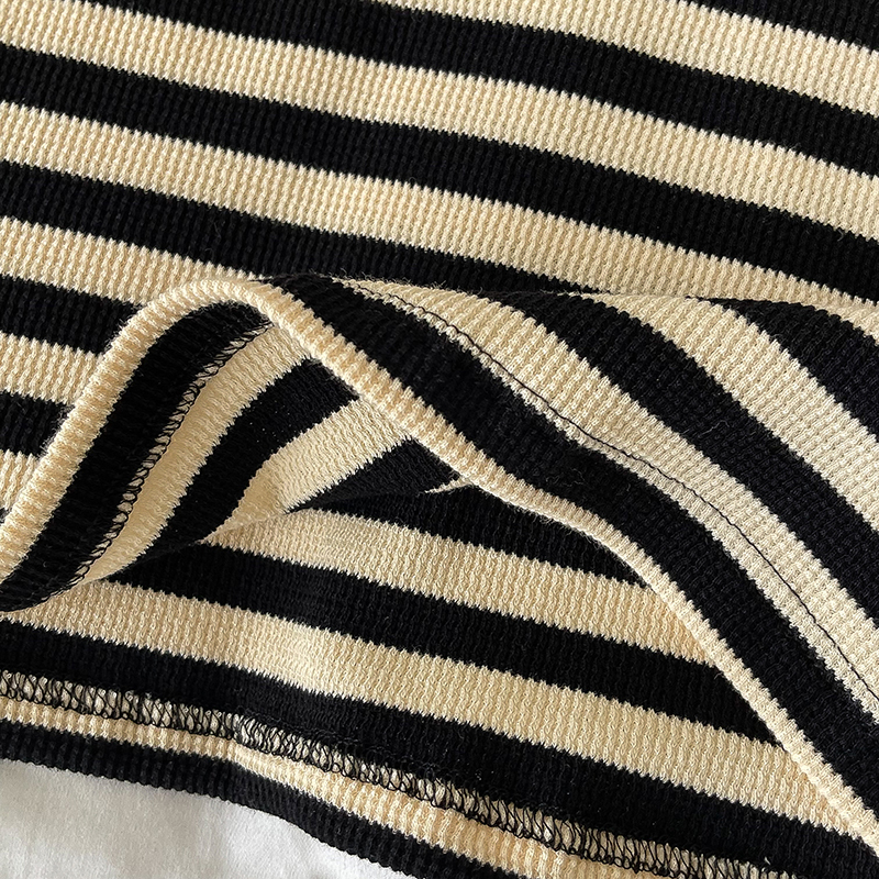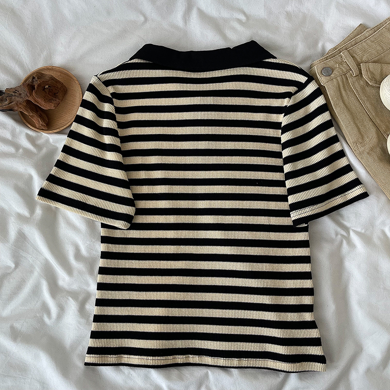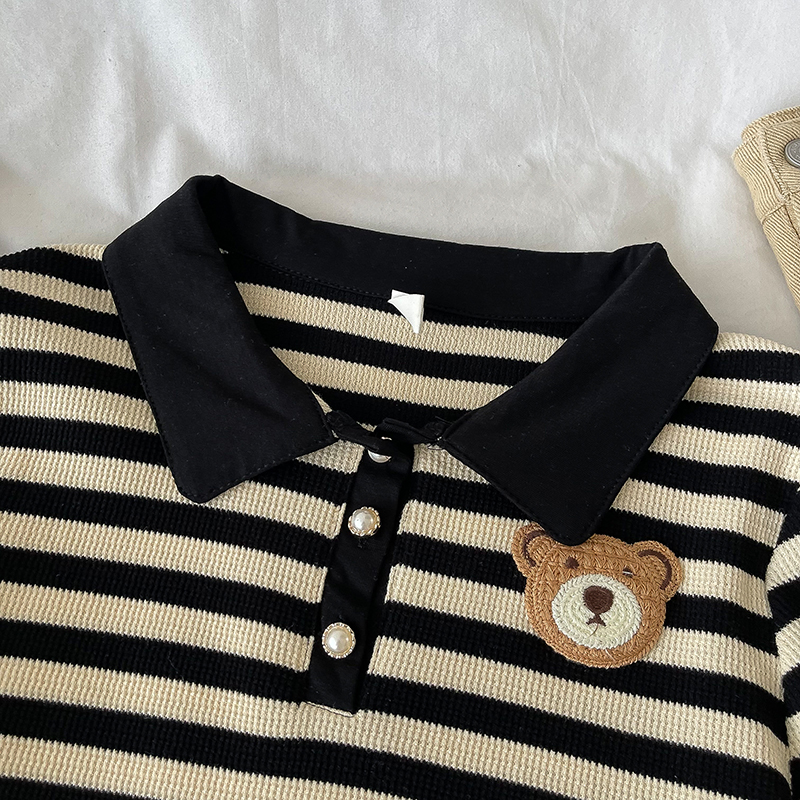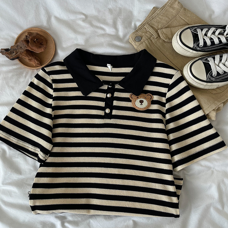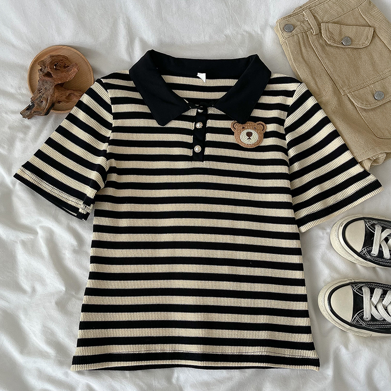 Vintage-style knitted black and cream striped short-sleeved top with with cure brown teddy bear face embroidery on the chest and faux pearl button detail below the collar.
