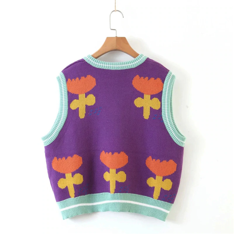 Cropped purple and mint green v-neck knit vest with tulips and stripe detailing.