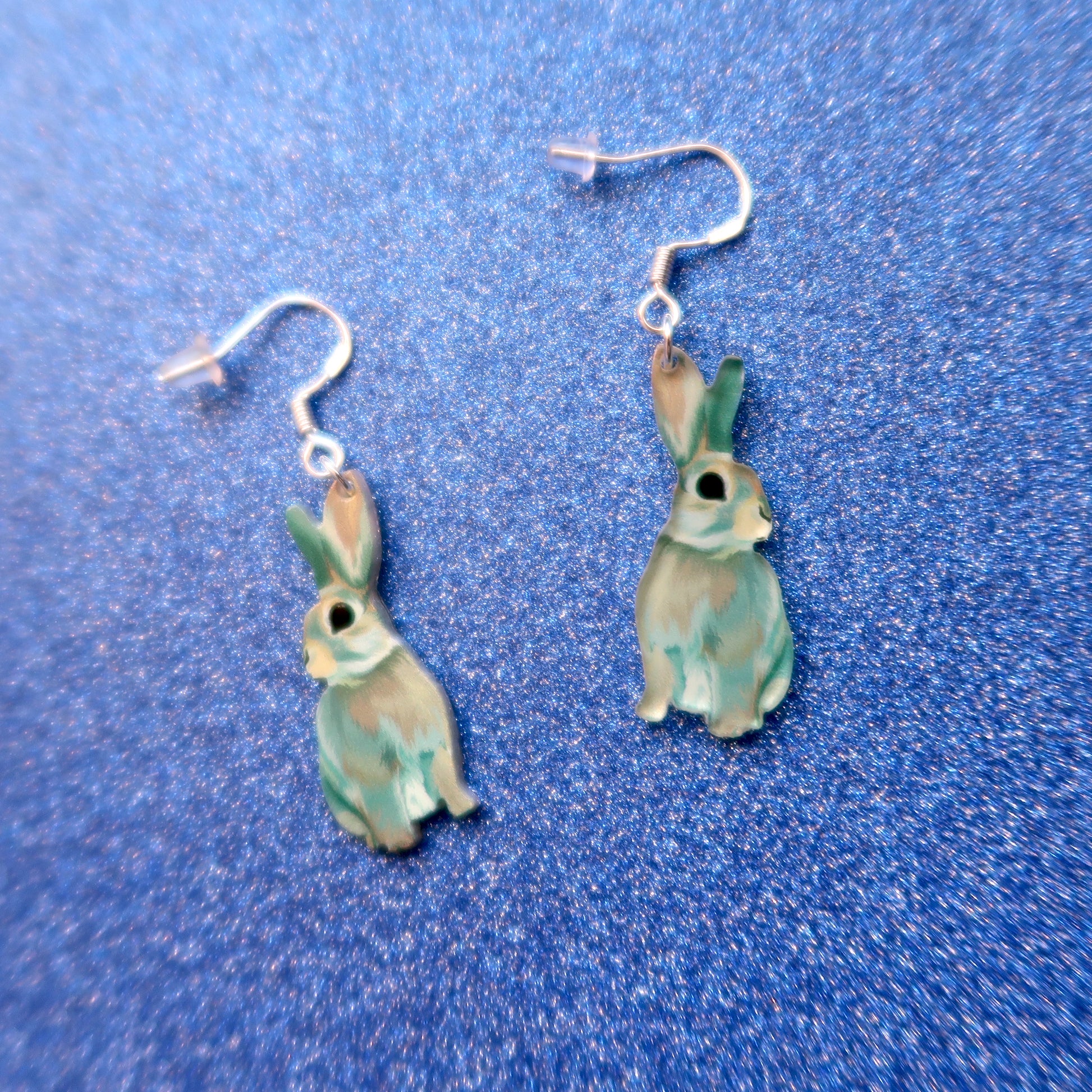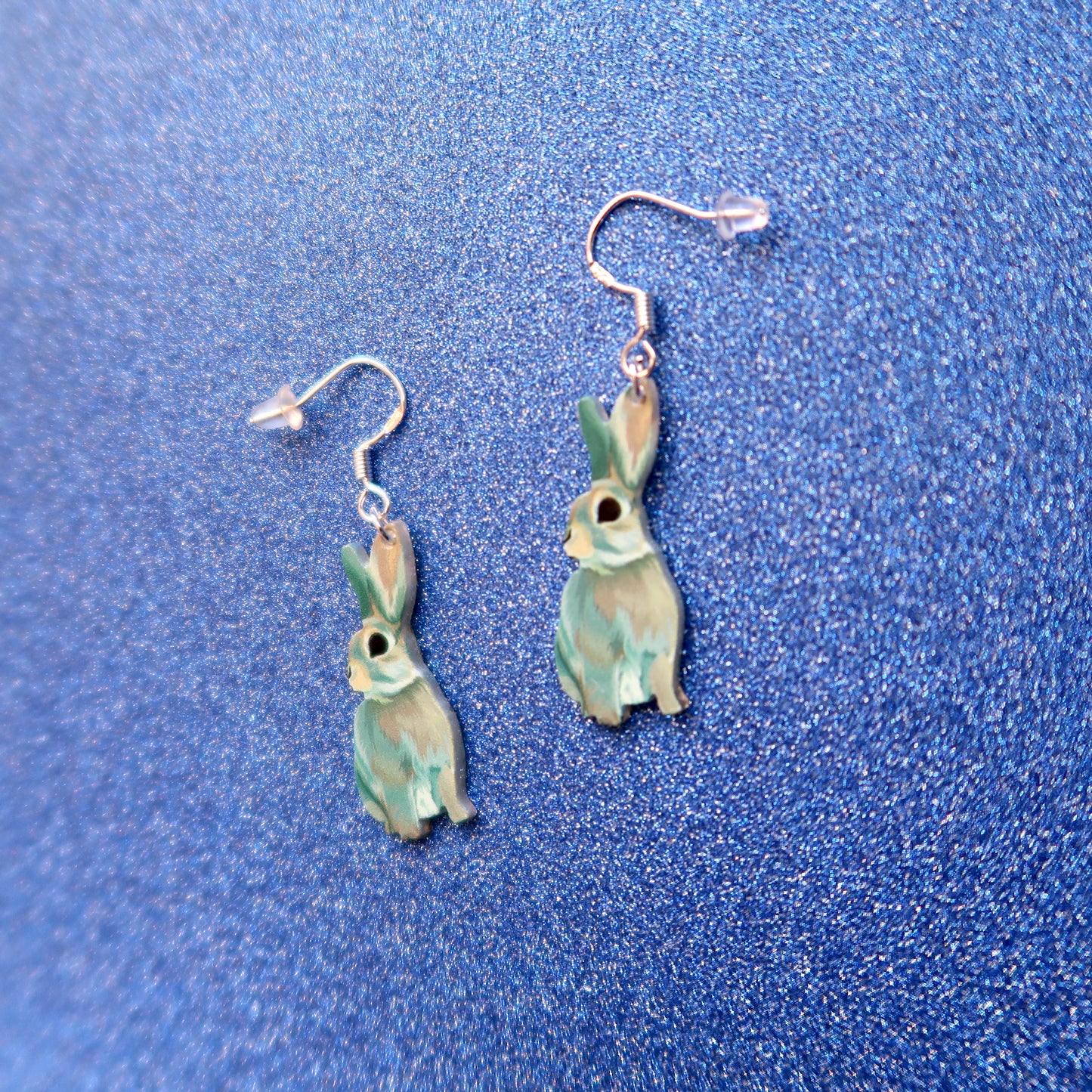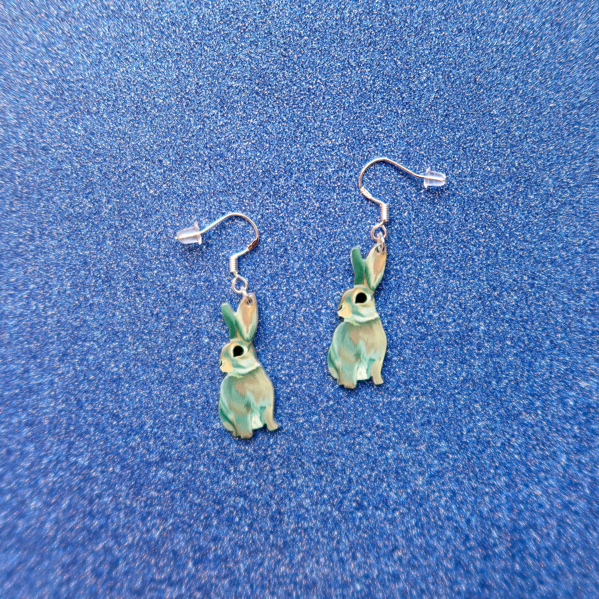 Add a touch of whimsy to any outfit with these charming bunny earrings! These dangly earrings are handcrafted with a glossy acrylic charm featuring a mint colored rabbit design (visible on both sides). It's the perfect accessory for any rabbit lover - or just anyone who appreciates cute and quirky jewelry. Hop to it and add these earrings to your collection!